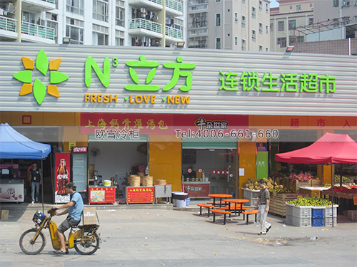 案例名稱:B138深圳龍崗N3生活超市水果展示柜-鮮肉展示柜-飲料展示柜